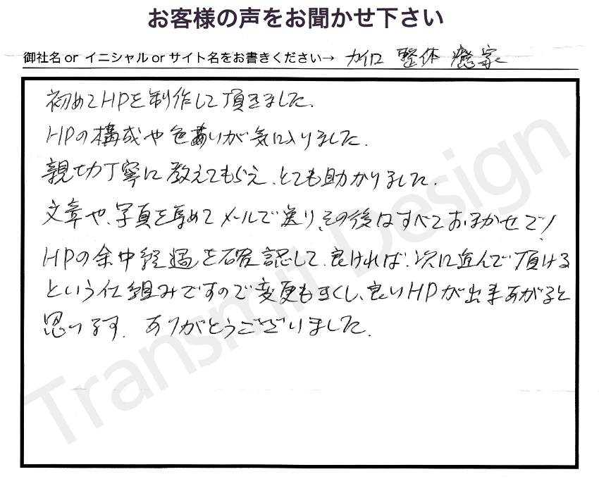 また、現在公開中のデザインを変更したい等のリニューアル作業も承っております。 個人事業(soho)ならではの手厚いサービスでサポートさせていただきますので、 ホームページ制作ならトランスミットデザインにご相談ください。